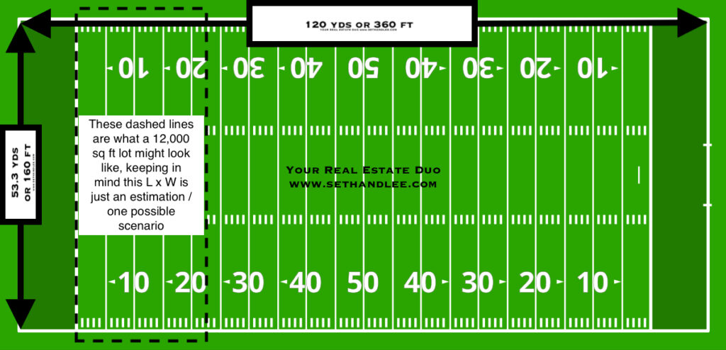 A quarter acre is 10,890 square feet. The parcel that inspired this blog post was about 70 feet by 170 feet, a little bigger than a quarter acre. The below image of a football field has black dashed lines overlayed to outline approximately 12,000 square feet.